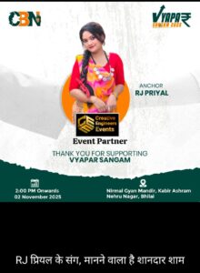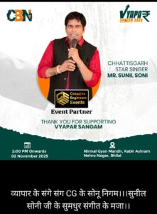 आगामी 2 नवम्बर को निर्मल ज्ञान मंदिर कबीर आश्रम नेहरू नगर में आयोजित होने वाला यह “व्यापार संगम 2025” छत्तीसगढ़िया व्यापारियों के लिए एक ऐतिहासिक कदम साबित होगा।इस कार्यक्रम के टाइटल स्पॉन्सर आशिर्वाद हॉस्पिटल,को_स्पॉन्सर जगदंबा इंटीरियर्स मॉड्यूलर किचन खपरी, एसोसिएट स्पॉन्सर स्वर्ण कलश एवं RCID LAB BHILAI, वेन्यू स्पॉन्सर – श्री महेंद्र कुमार साहू जी(डिजाइन कंसलटेंट),डिजिटल पार्टनर_पाथ आइडिया मल्टीस्किल, टेक्निकल पार्टनर_सिविल टेक्निकल सॉल्यूशन एवं आकर डिजाइन,डिजाइन पार्टनर_ HD आर्ट वर्क, प्रिंटिंग पार्टनर_इंडियन प्रेस,गिफ्टिंग पार्टनर _हमर हटरी एवं इवेंट पार्टनर_क्रिएटिव इंजीनियर्स इवेंट्स है।